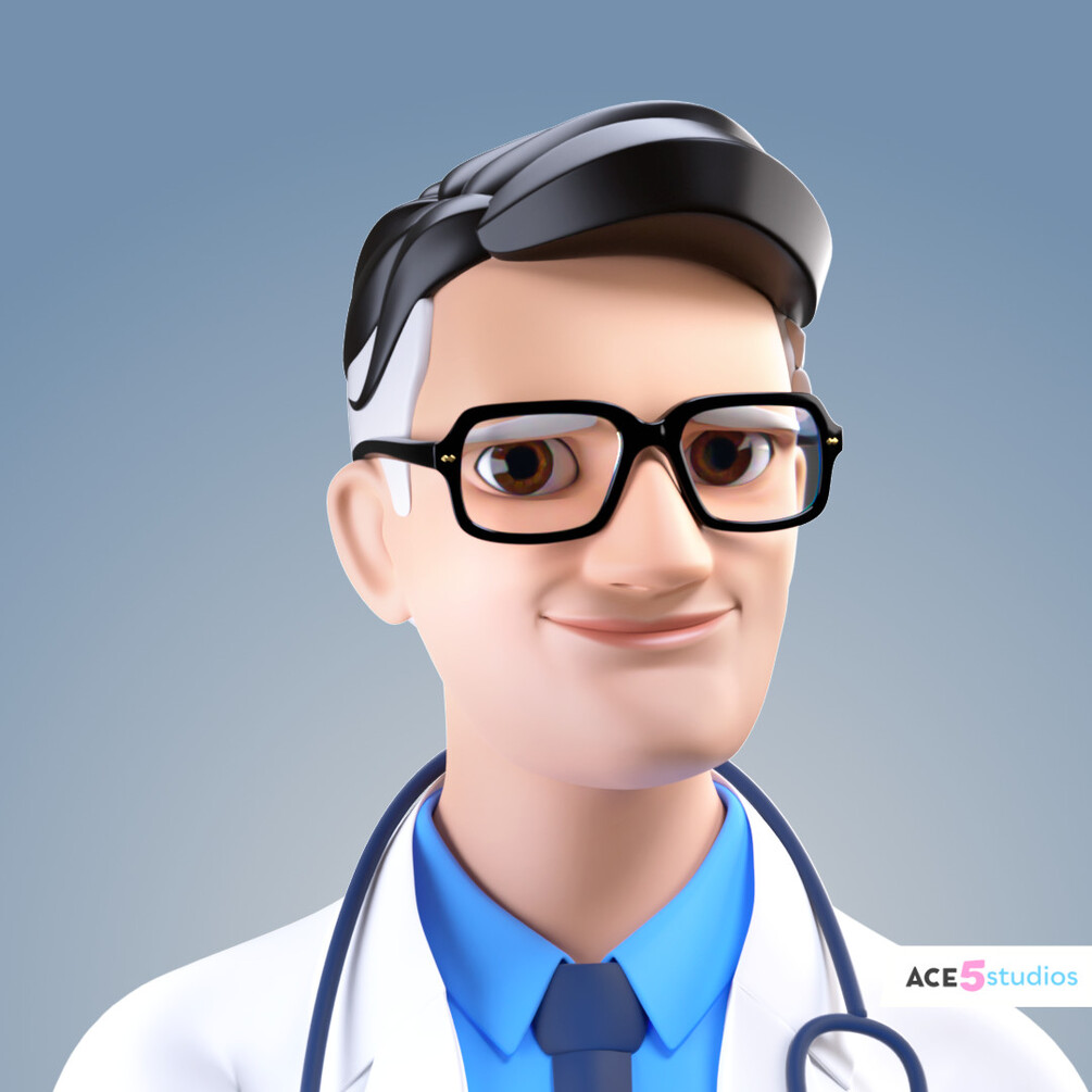 Doctor Marty is a stylized cartoon male character rigged in Cinema 4D. He has a face rig and a body rig.