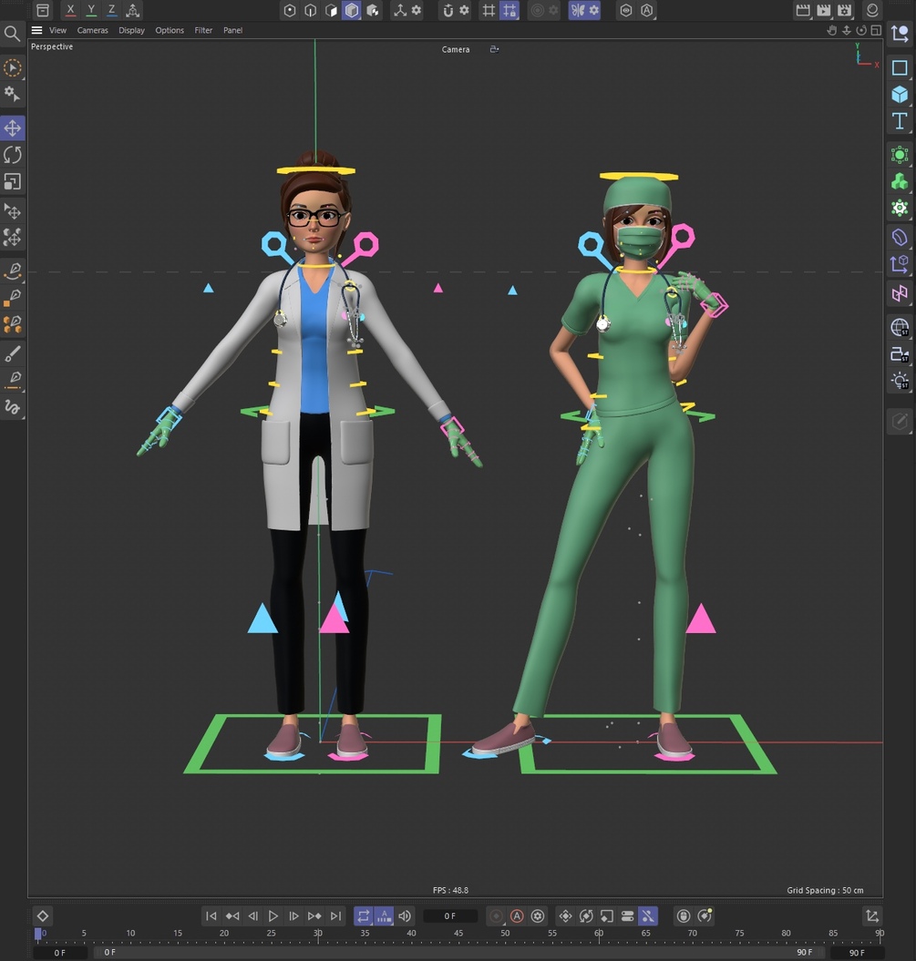 Doctor Melissa is a stylized cartoon female character rigged in Cinema 4D. She has a face rig and a body rig.